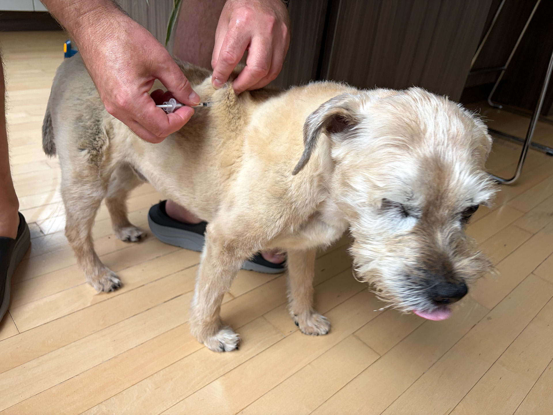 It happens to everyone, especially if your dog has long or thick fur, or moves unexpectedly during the injection. Parker is a Terrier and despite his advanced age can still move quickly.